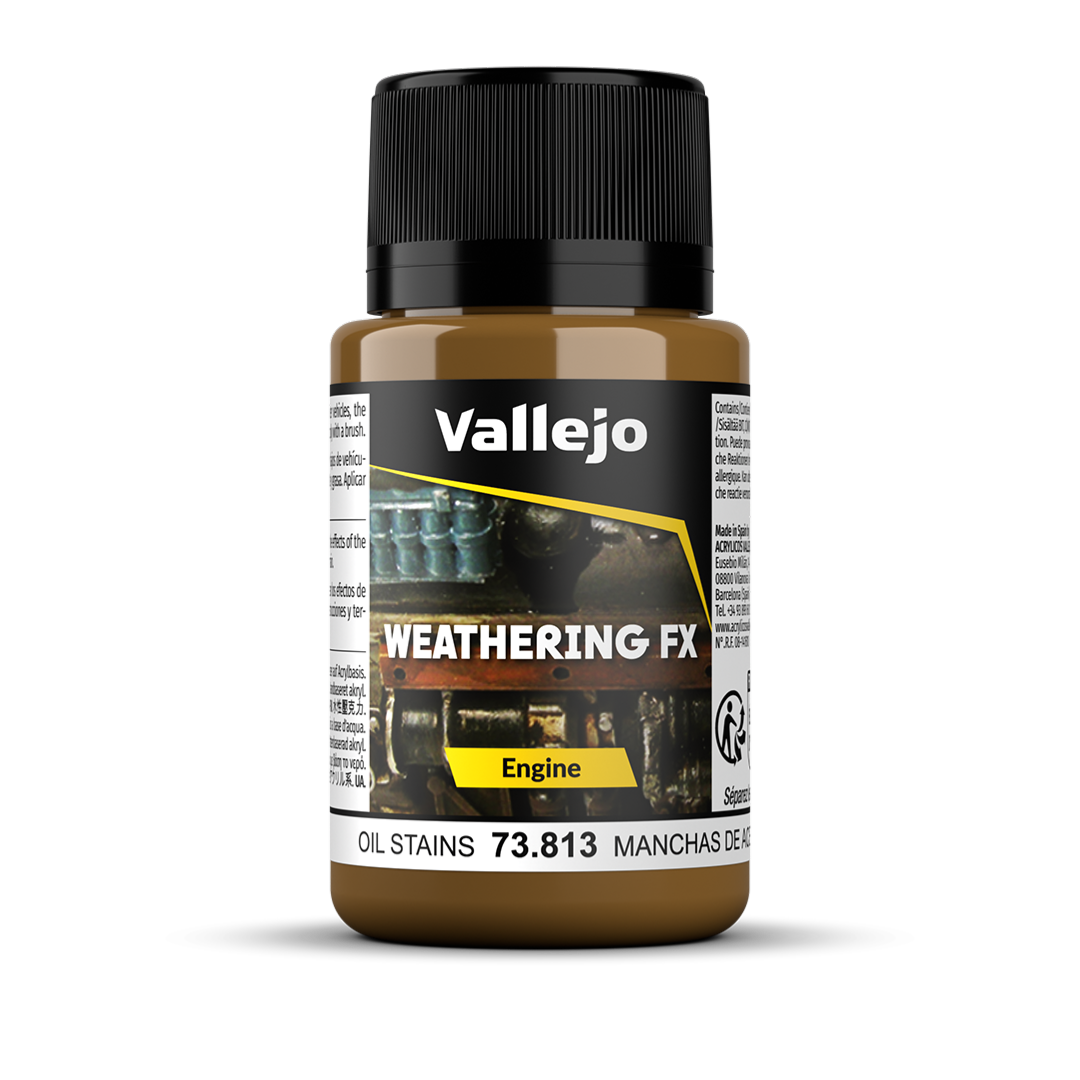 Le ton, la viscosité et la finition brillante donnent un rendu très réaliste sur les moteurs et autour des pièces mobiles des véhicules. Les taches d’huile peuvent être réalisées en éclaboussures ou en coulures plus ou moins transparentes. Les véhicules et leurs moteurs sont composés de nombreuses pièces mobiles (roues, chaines, essieux, roulements, charnières) et toutes ces pièces doivent être lubrifiées. Traces d’huile, de carburant, poussière et saleté s’y accumulent.
